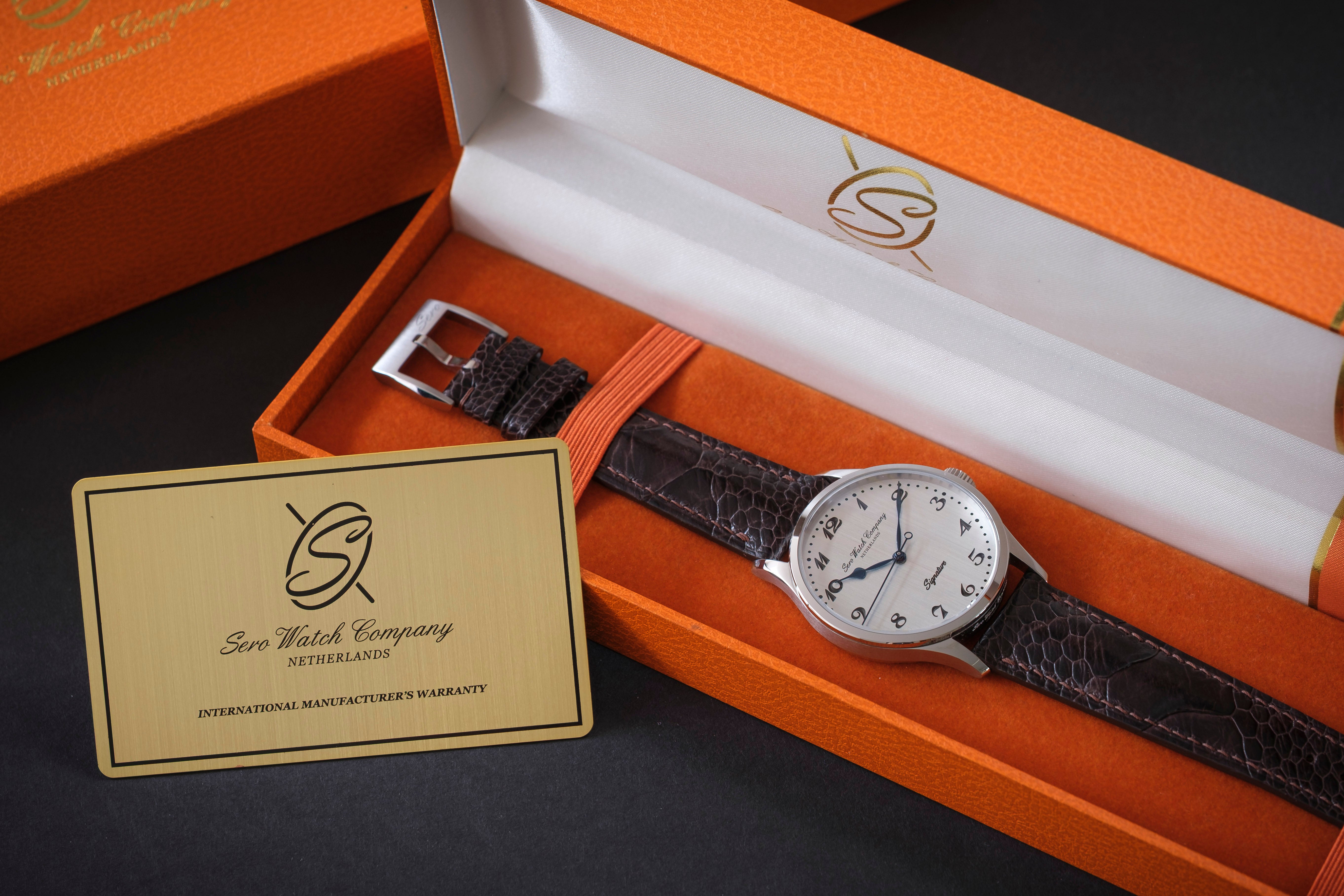 All Signature watches come in a bespoke orange leatherette box, inspired by vintage watch boxes from the 1930s–1960s. The design features golden accents, a vertically signed banner, and a creamy silk interior with soft orange suede linings.